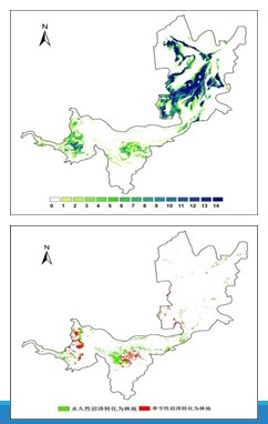 季節性沼澤減少直接導致珍稀鳥類和魚類食物來源的減少,造成棲息地環境質量下降甚至破壞;季節性沼澤的喪失和退化將使洞庭湖濕地的生物多樣性降低。最顯著的是西洞庭湖和南洞庭湖區林地面積的快速增加,主要由沼澤轉化而來,如圖,其中永久性沼澤轉化為林地共14800 公頃,由季節性沼澤轉化為林地為7900公頃 。