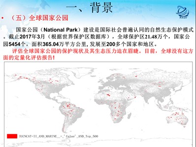 保護區評價,目前開展的是全球國家公園保護現狀和生態壓力評估正在做工作,首先為什么要干這項工作,加強國家公園保護狀態和生態壓力定量化評估,有助于人類了解地球上最美麗的生態環境資源的性質和數量以及人類自身對這些資源產生了什么的壓力,有助于提高人類關于自然保護與持續發展的科學認識和面對生態環境退化的應對能力。有助于提升我國在世界上生態環境保護的地位和話語權。有助于提升我國在全球國家公園建設、生態安全維護和“一帶一路”戰略布局都具有重要的參考價值。通過研究世界上最好的范例,對中國國家公園體制改革試點、中國國家公園建設彎道超車和中國保護區事業健康發展均具有一定的借鑒意義。