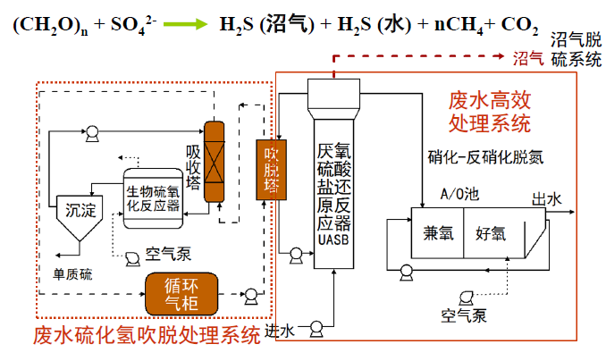 在高硫酸鹽廢水處理集成系統中,首先硫化氫先經過吹脫處理,降低硫化氫對后續反應中對厭氧反應的抑制。經吹脫過的廢水進入厭氧硫酸鹽還原反應器,進行一系列后續高效的硝化與反硝化處理,最終出水達標排放(圖1-9)。