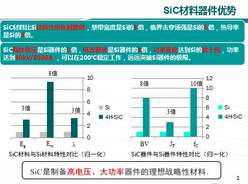 在電力裝備中電力電子器件是最重要的部分之一,但是,目前電網輸送電壓500kV、800kV甚至達到1100kV,最基本的電力電子器件,Si器件,已經達到了由Si材料性能確定的極限,難以滿足智能電網的要求,更高電壓、更大容量、更高效率、更高結溫,亟需新型戰略性的材料器件體系。SiC材料的禁帶寬度是Si的3倍,臨界擊穿場強8倍,熱導率是3倍,材料性能優勢明顯。SiC器件的耐壓是Si器件的10倍,電流密度3倍,頻率是Si的10倍,是制備高電壓、大功率器件的新型戰略性材料。