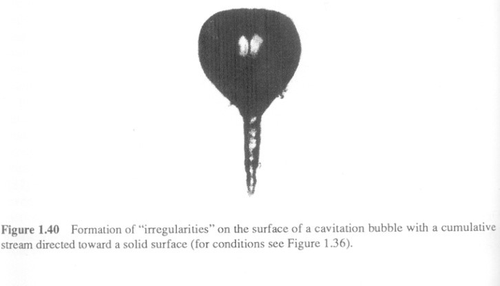 再解釋一下氣泡的潰滅。氣泡的潰滅與氣泡的破滅是完全不同的過程。氣泡的潰滅是指氣泡由大變小,最后變沒的過程,這不同于氣球由小到大最終破滅的過程。破滅產生不了高溫、高壓,只有潰滅才能產生高溫、高壓。我們講氣泡的潰滅,有的人叫湮滅,有的人叫塌縮等等,這是學術上的不同說法。