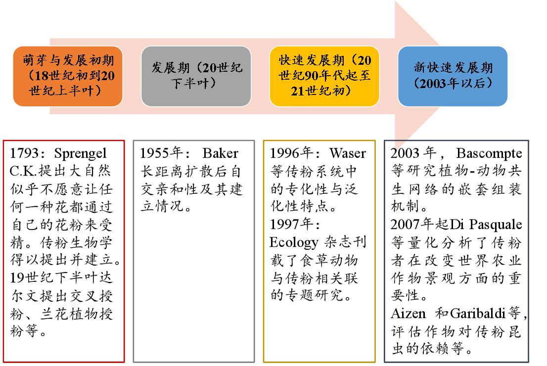 由于傳粉昆蟲(chóng)的重要性以及目前所面臨的危機(jī)已經(jīng)引起科學(xué)家和民眾的廣泛關(guān)注。諸多地區(qū)級(jí)、國(guó)家級(jí)乃至全球級(jí)別的傳粉研究已經(jīng)取得了階段性的成果。就全球范圍來(lái)說(shuō),傳粉昆蟲(chóng)的研究主要包括四個(gè)時(shí)期,分別為:1)萌芽與發(fā)展初期(18世紀(jì)初到20世紀(jì)上半葉);2)發(fā)展期(20世紀(jì)下半葉);3)快速發(fā)展期(20世紀(jì)90年代起至21世紀(jì)初);4)新快速發(fā)展期(2003年以后)。