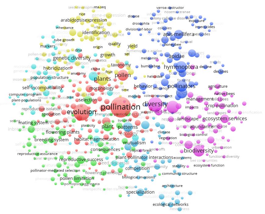 與此同時(shí)我們還通過(guò)ESI對(duì)pollination和pollinator等關(guān)鍵詞進(jìn)行檢索,可以大致得出傳粉昆蟲(chóng)研究領(lǐng)域的現(xiàn)有研究前沿如下:1)常用新煙堿類殺蟲(chóng)劑對(duì)蜜蜂的殺傷作用;2)野生授粉昆蟲(chóng)對(duì)農(nóng)業(yè)增收和作物健康的積極影響;3)傳粉昆蟲(chóng)種群測(cè)量與評(píng)估;4)花朵與傳粉昆蟲(chóng)的生態(tài)聯(lián)系。通過(guò)利用Vos Viewer軟件繪制傳粉生物學(xué)關(guān)鍵詞共現(xiàn)(co-occurrence)聚類圖,獲得傳粉生物學(xué)領(lǐng)域的研究熱點(diǎn)包括:1)傳粉昆蟲(chóng)的形態(tài)學(xué)、系統(tǒng)進(jìn)化、分類學(xué)方面的研究;2)傳粉昆蟲(chóng)介導(dǎo)的植物繁殖、選育、選種等的研究,以及花粉限制對(duì)傳粉昆蟲(chóng)的影響;3)殺蟲(chóng)劑導(dǎo)致傳粉昆蟲(chóng),尤其是蜜蜂、熊蜂的種群下降的影響;4)傳粉昆蟲(chóng)介導(dǎo)的植物基因表達(dá)、生長(zhǎng)、增產(chǎn)等;5)景觀變化、城市化等環(huán)境因素導(dǎo)致生物多樣性降低、傳粉服務(wù)功能下降、傳粉昆蟲(chóng)群體數(shù)量下降等影響評(píng)估,并提出相關(guān)的控制與管理措施;6)植物-傳粉昆蟲(chóng)互作與共生、植物與傳粉昆蟲(chóng)形成的生態(tài)網(wǎng)絡(luò)結(jié)構(gòu)等方面的研究;7)傳粉使植物基因流擴(kuò)散,使植物基因變異和多樣性。